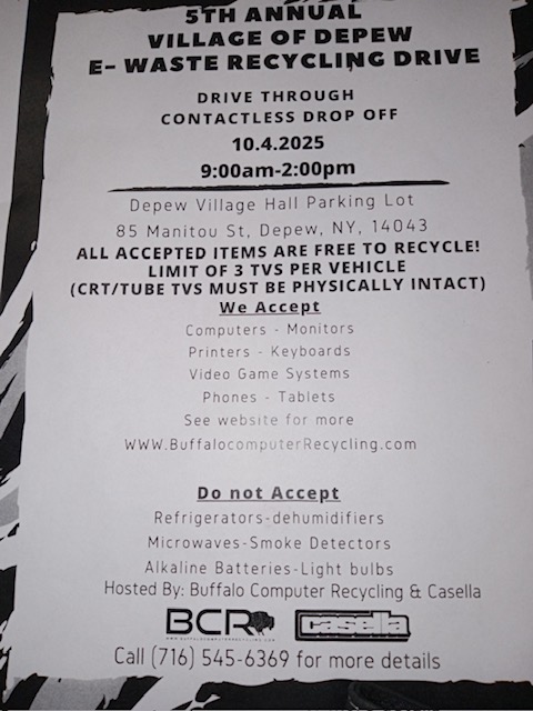 Depew Annual e-Recycling Event October 4, 2025, 9:00AM-2:00PM, Flyer